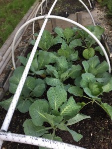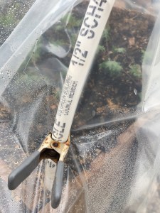 Simply buy ten foot lengths of 1/2” PVC pipe. The number you need will depend on how long your garden bed is. I like to place them every few feet (roughly). You will also need one for the top of each bed, creating a spine, if you will. If your raised bed is longer than 10 feet, you will either need a longer spine, or perhaps you can put a couple pieces together.